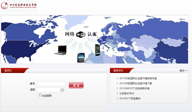 首先,启用认证后,用户在IE浏览器键入任意一个外网的网址都将自动跳转到portal认证界面,界面如图1-1(稍后我们会将默认界面修改为院首页)