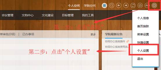 第一步:打开协同办公系统,点击主页右上角“齿轮”,点击“个人设置”